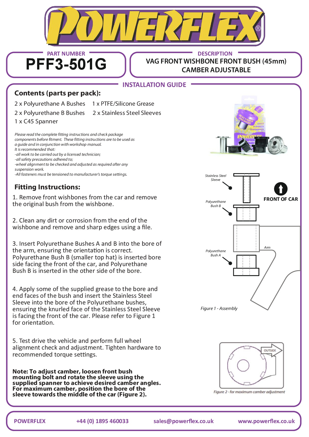 Deze bus heeft een CNC-gefreesde roestvrijstalen huls met een offset boring die kan worden gedraaid met behulp van ons op maat gemaakte gereedschap (meegeleverd), wat zorgt voor +/- 0,5 graden camber-aanpassing op de auto. Voor de kleinere 30 mm bus, gebruik dan onderdeelnr. PFF85-201G. CNC-gefreesde roestvrijstalen huls met gekarteld uiteindepatroon om ongewenste rotatie te voorkomen. Draai om camber aan te passen.
