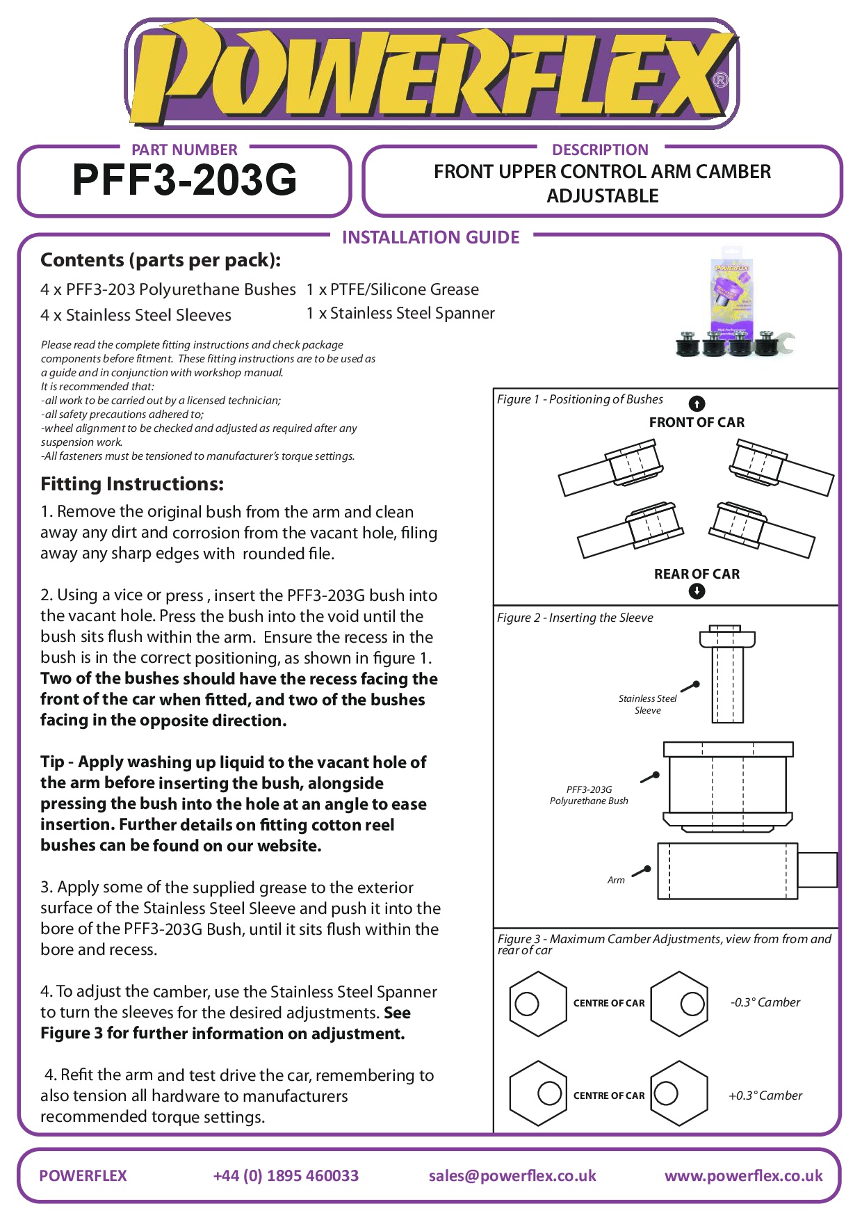 Met de PFF3-203G kunt u de voorste camber/caster/toe nauwkeurig afstellen. Perfect voor het afstellen van de uitlijning, het verbeteren van de handling en het minimaliseren van bandenslijtage. De offset sleeve maakt camberaanpassing tot +/- 0,3 mogelijk.