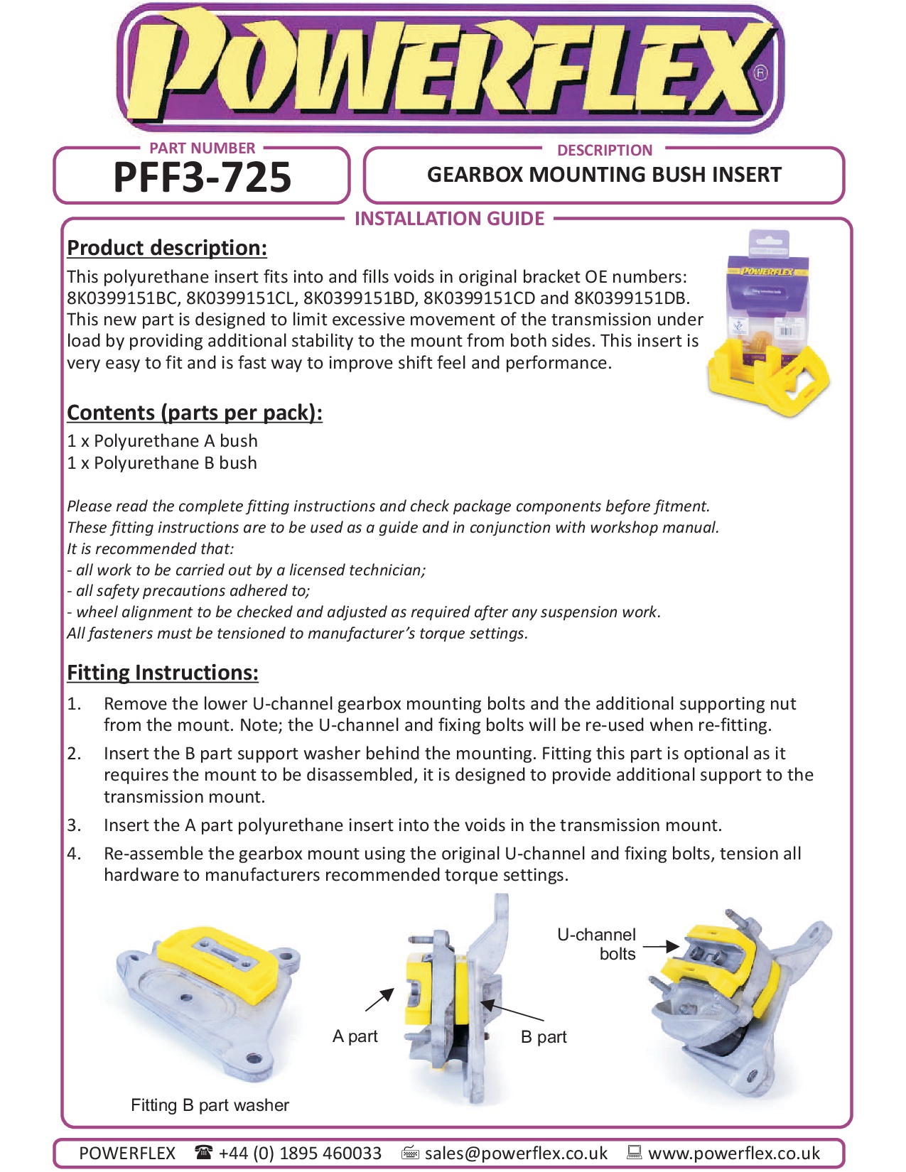 PFF3-725BLK is een tweedelig inzetstuk ontworpen om de transmissiebeweging onder belasting te beperken. De onderste A-bus dient om de holtes van de originele rubberen houder op te vullen, terwijl de bovenste B-bus als buffer fungeert om beweging tussen het bovenste en onderste gedeelte van de houder te elimineren. Bij het verstevigen van de verbindingssteun tussen de transmissie en het chassis moet een toename van de NVH worden verwacht. Hoe harder het materiaal, hoe groter de NVH die wordt overgedragen. Als de verhoogde NVH als te veel wordt beschouwd, kan de bovenste B-Bush worden verwijderd om dit te verlichten. Voor de Audi A7 past dit onderdeel alleen op modellen met voorwielaandrijving.
