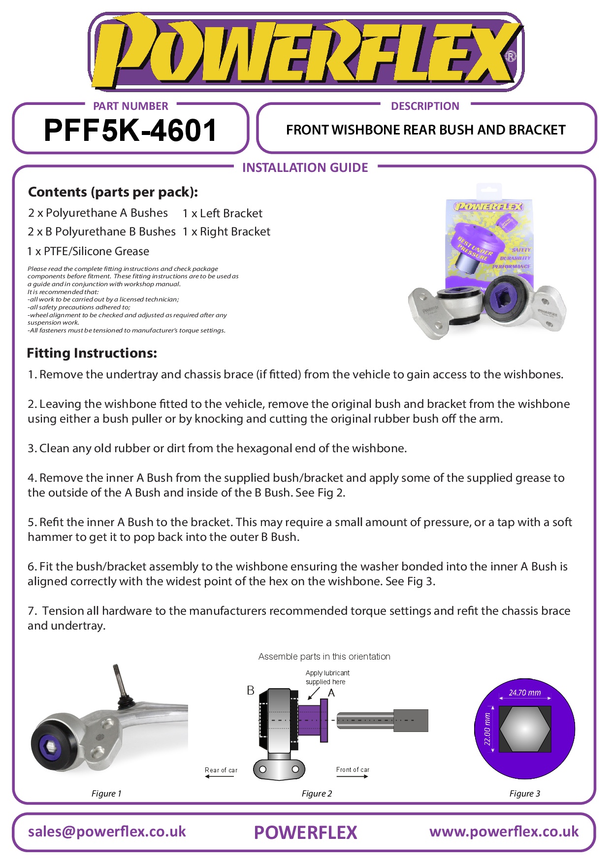 PFF5K-4601 Voorste Wishbone achterste bus en beugel passen op BMW E46 en Z4, exclusief M3, en gebruiken onze PFF5-4601 bus, die zowel de maten 60 als 66 mm dekt. Gissen of meten is niet meer nodig! Een duurzaam, beter presterend polyurethaan busalternatief, zoals Powerflex, is altijd een populaire upgrade geweest voor eigenaren, maar hoewel onze bussen zeer eenvoudig te monteren zijn, kan het soms moeilijk zijn om de originele bussen uit de OE-behuizingsbeugels te verwijderen, vooral voor mensen met beperkte toegang tot pers- of trekgereedschap. Ze zijn vooraf geïnstalleerd in bijgeleverde kwaliteitsbeugels en hoeven alleen maar op de arm te worden gemonteerd en op hun plaats te worden vastgeschroefd, wat zowel tijd als geld bespaart.