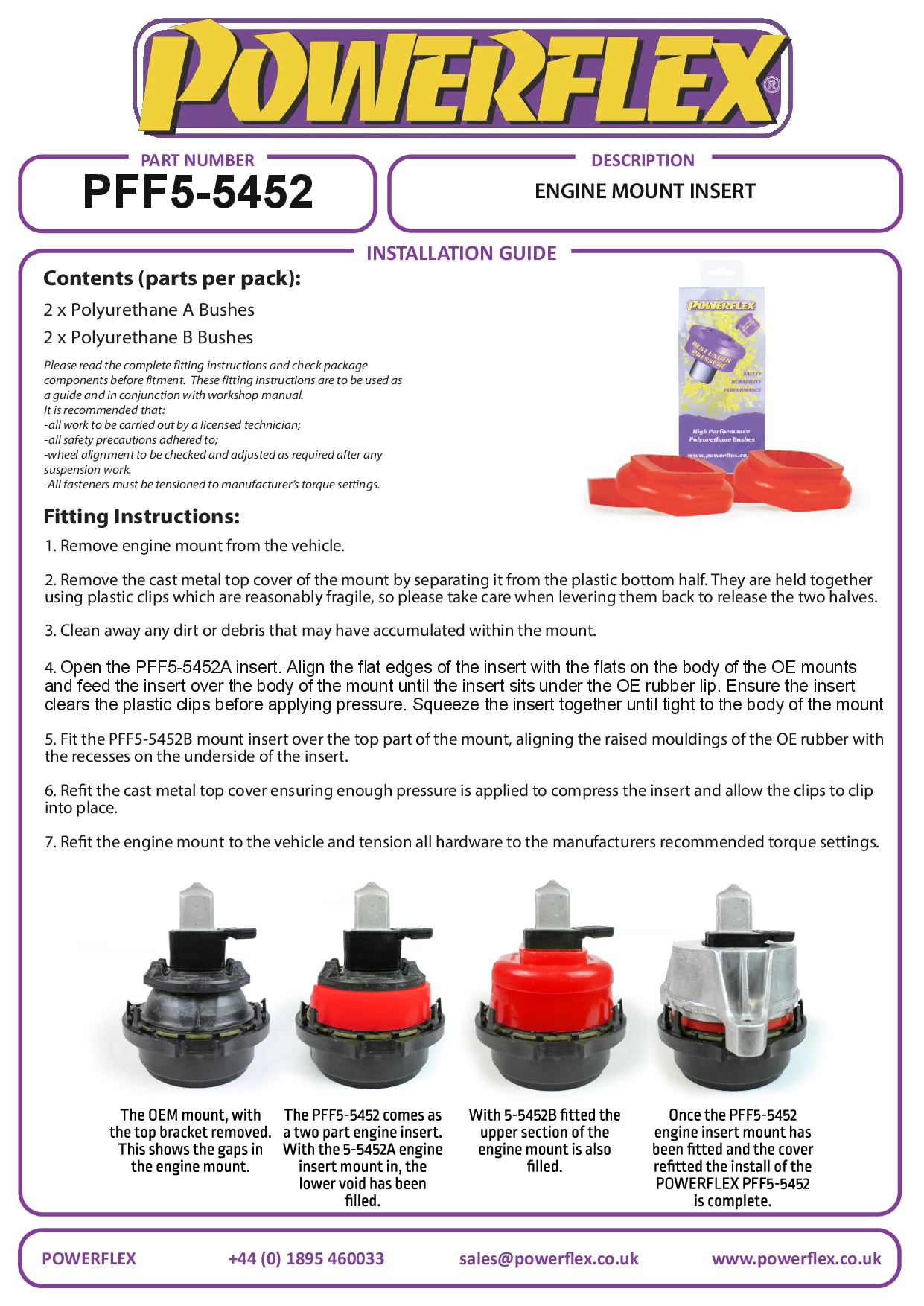 PFF5-5452 Engine Mount Insert is een tweedelige set gemaakt met ons Red 65A durometer materiaal, ontworpen om de holte van de OE rubberen houder te vullen om de beweging van de aandrijflijn te beperken en de gasrespons te verscherpen op standaard of licht getunede voertuigen. De stijfheid van de houder is met 100% toegenomen. Een kleine toename van NVH, meestal bij stationair draaien, moet worden verwacht bij het verstevigen van de verbindingshouder tussen de motor/transmissie en het chassis. Hoe harder het gebruikte materiaal, hoe groter de NVH-overdracht. Past alleen op 3.0ltr B58 motoren.