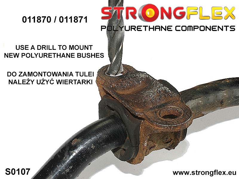 In order to install a new polyurethane bush, the stabilizer clamp must be drilled. Do not drill through the clamp!