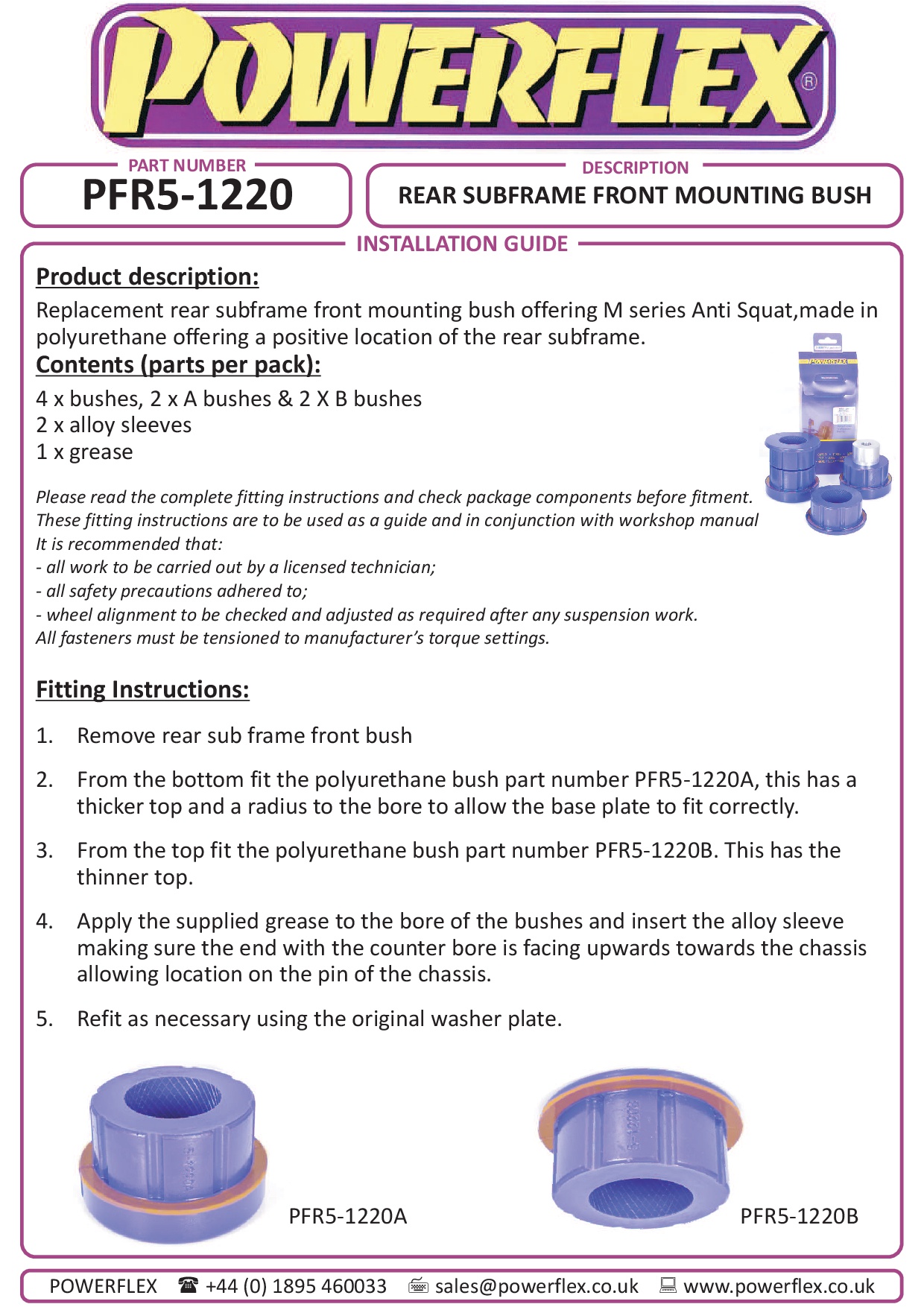 PFR5-1220 is a full replacement bush for non-M models to raise the front of the rear subframe by 9mm, providing the same anti-squat characteristic during acceleration as featured on M model vehicles and is made using our Purple 80A durometer material, recommended for heavily tuned road or occasional track cars. For standard subframe alignment, without anti-squat, please use PFR5-420.