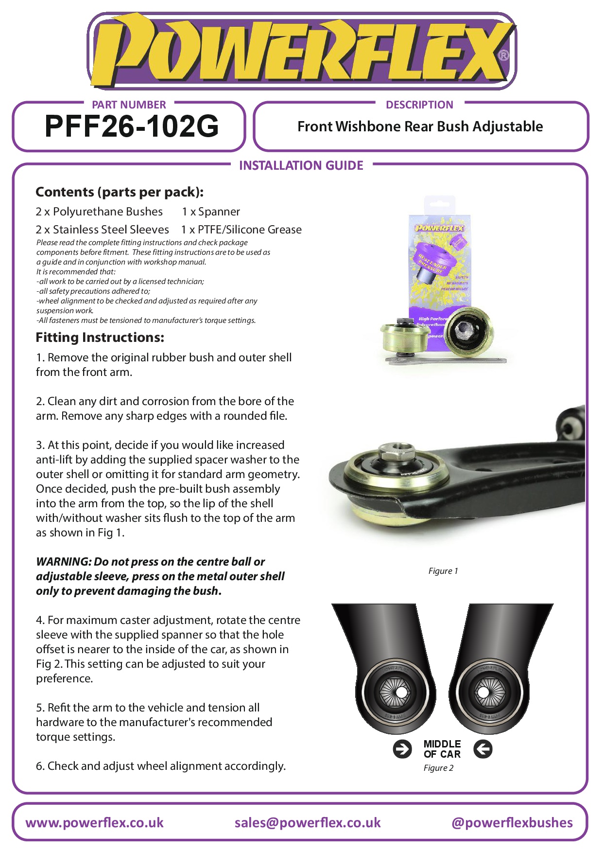 Ontworpen rond onze unieke instelbare Nylon/Polyurethaan kogelgewrichtcombinatie op de auto voor meer directe stuurinput en verbeterde bochten en remmen. De offset boring maakt +/- 0,75 van caster aanpassing mogelijk met een meegeleverde sleutel om de fijnafstelling van de wielgeometrie van de auto te ondersteunen. Optionele ringen zijn inbegrepen om anti-liftgeometrie toe te voegen, wat de grip van het voorwiel bij acceleratie verbetert. Het monteren van deze bus kan resulteren in een kleine hoeveelheid camberverandering, dus het monteren van PFF26-101G voor Wishbone voor Bush Camber Adjustable wordt aanbevolen om elke camberverandering te neutraliseren of te verbeteren.