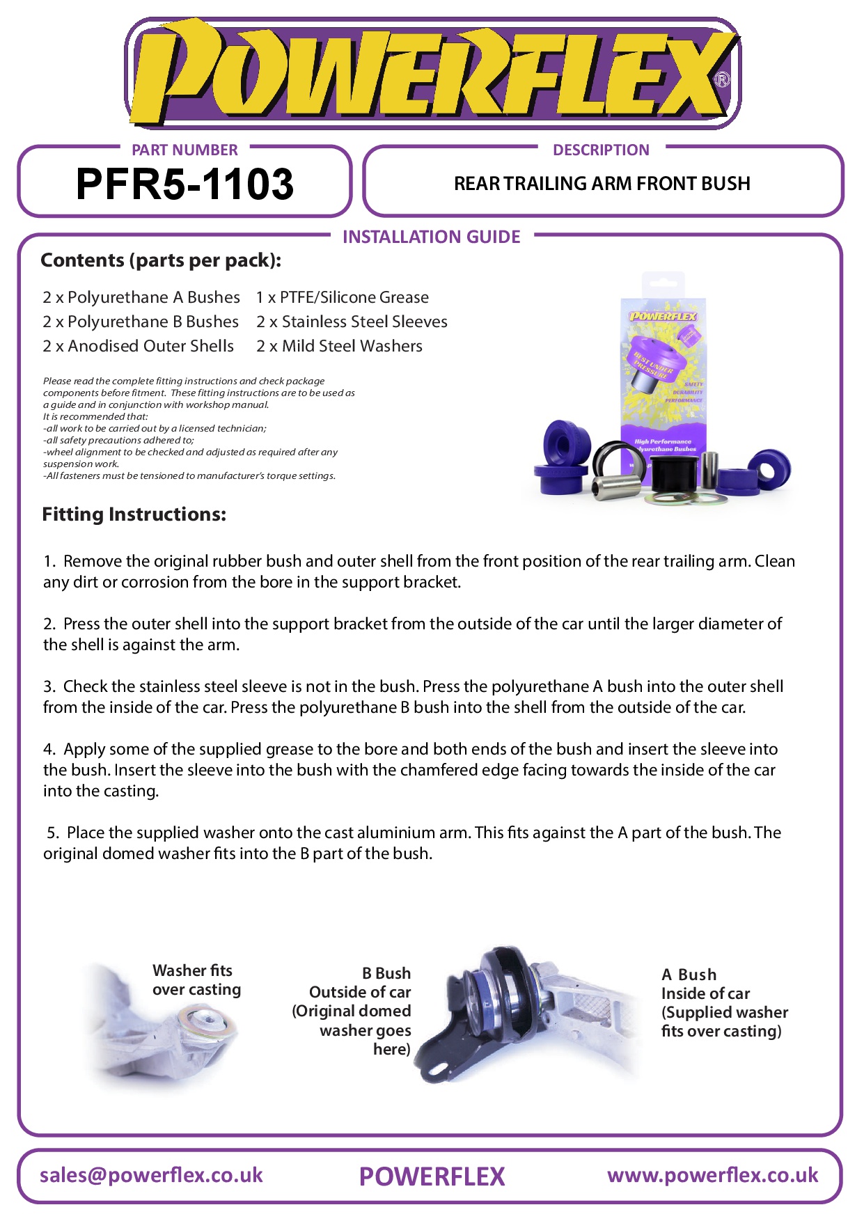 PFR5-1103 is een complete bus die past in de trailing arm bracket OE-nummers: 33306799089 33306799090, 33309807099 en 3330980710. Gebruik voor inserts PFR5-1102 die past in de originele rubberen bus. Deze bus past op GEN2-modellen.