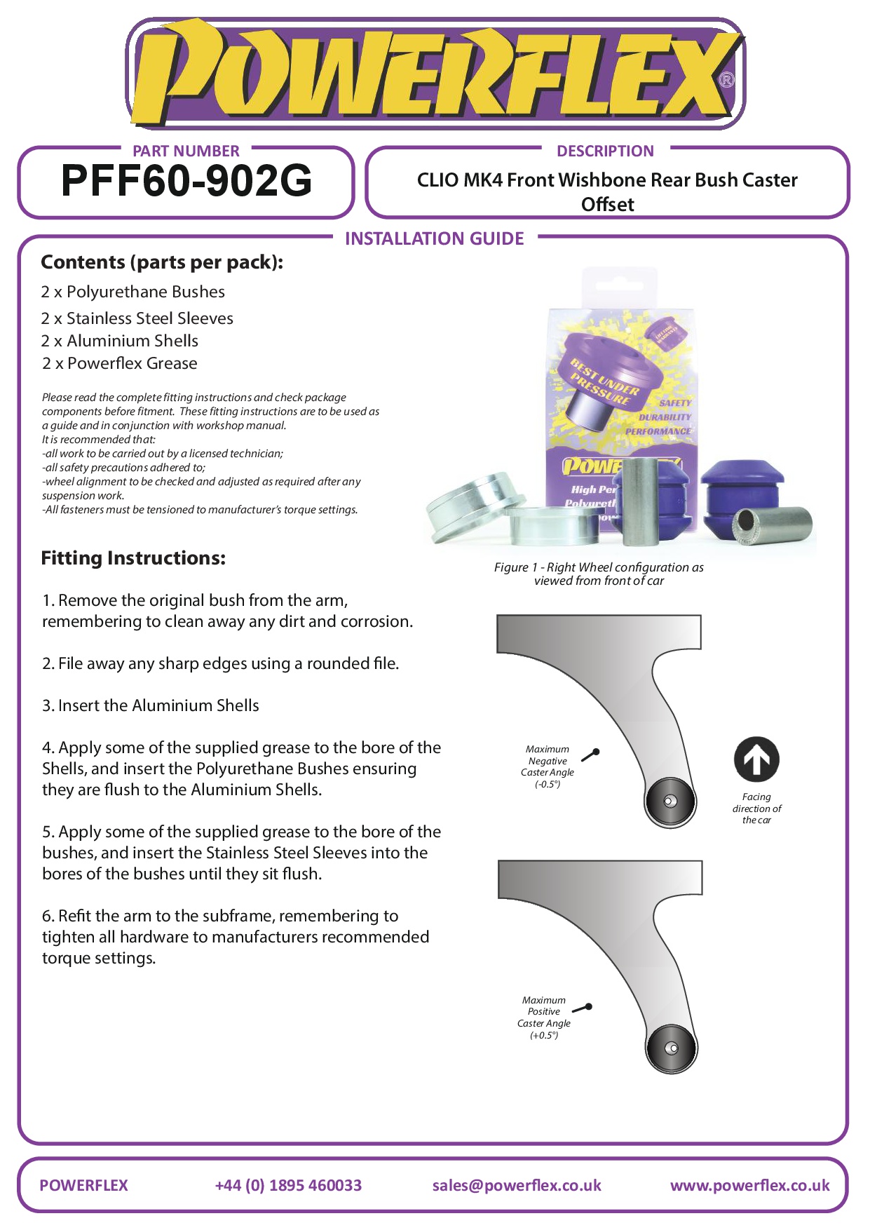 PFF60-902G biedt een vaste offset van 4 mm om +/- 0,5 caster offset te bieden voor een verbeterd stuurgevoel. Extra caster creëert ook extra negatieve camber in de bocht, wat zorgt voor beter contact van de band met de weg bij zware bochten. Voor een versie van deze bus zonder offset gebruikt u PFF60-902.