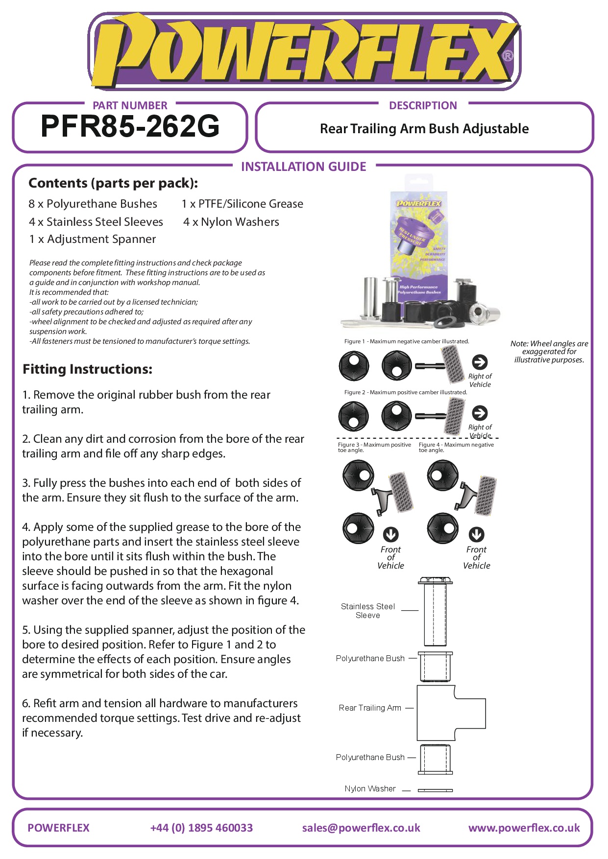 De PFR85-262G is voorzien van een verstelbare roestvrijstalen huls waarmee u de toe- en camberhoek van de achterwielen met de meegeleverde sleutel met +/- 1 kunt verstellen. De huls is gemaakt van ons Black 95A-materiaal, wat zorgt voor een groter bereik aan instelbare offset, terwijl de stijfheid en betrouwbaarheid behouden blijven.